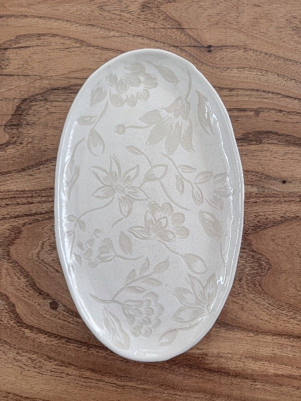 Bandeja con flores esgrafiadas en blanco y natural